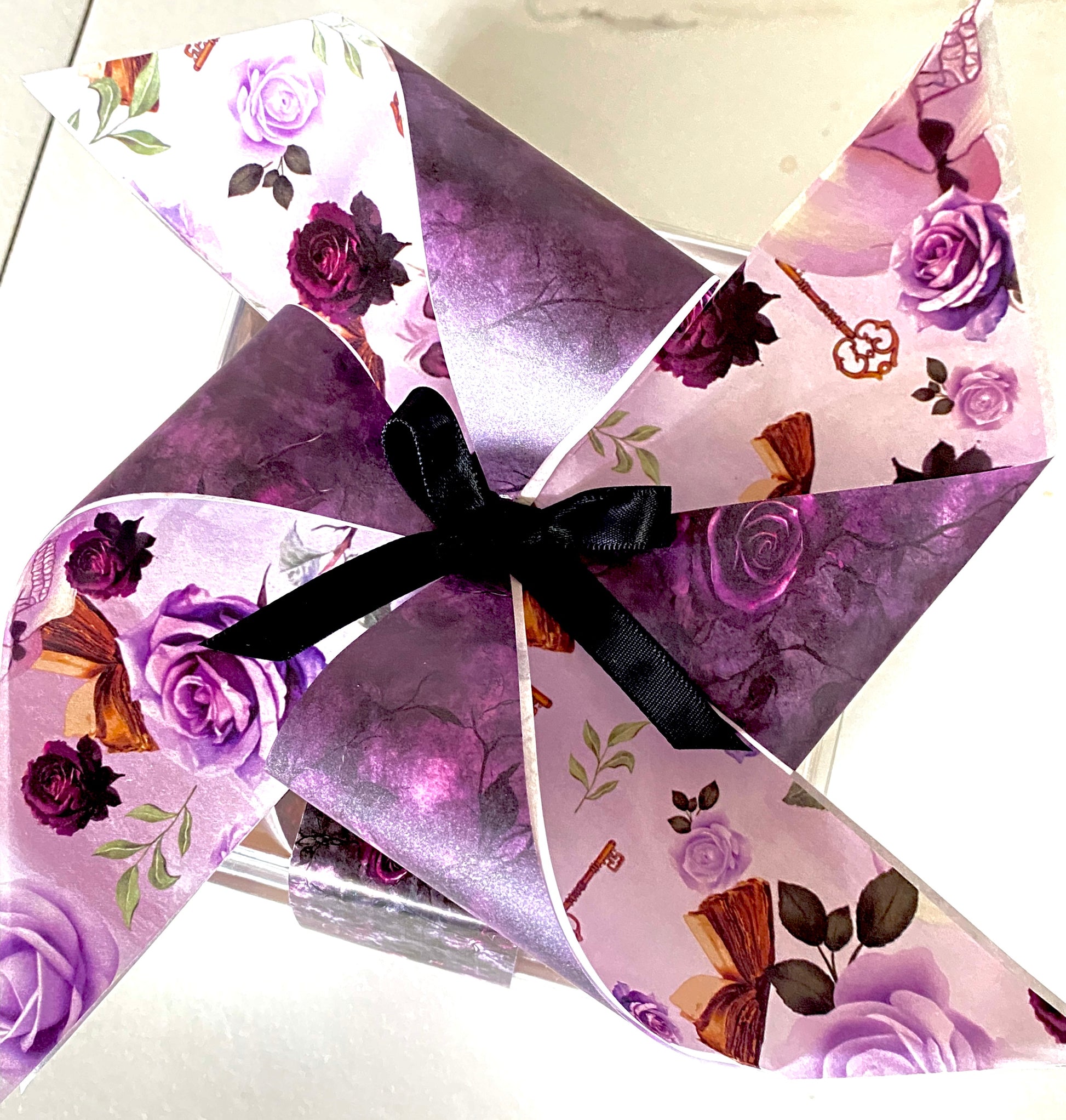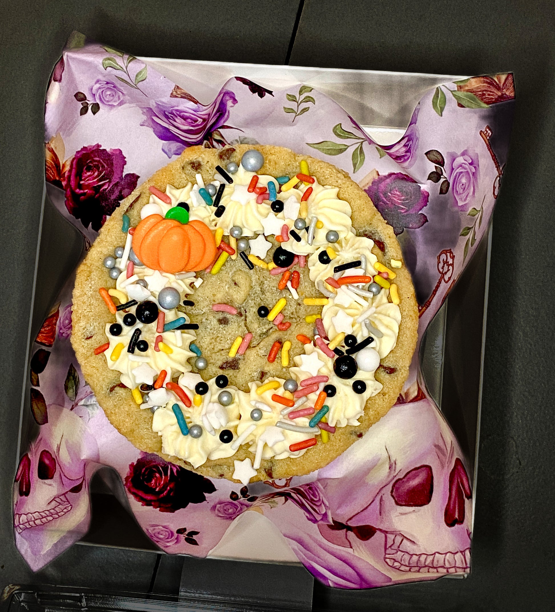 4-“ Cookie Cakes decorated in fall sprinkles and non-dairy frosting. A cheerful gift or a just because portable dessert packaged in a box with a whimsical Halloween themed pinwheel bow.
